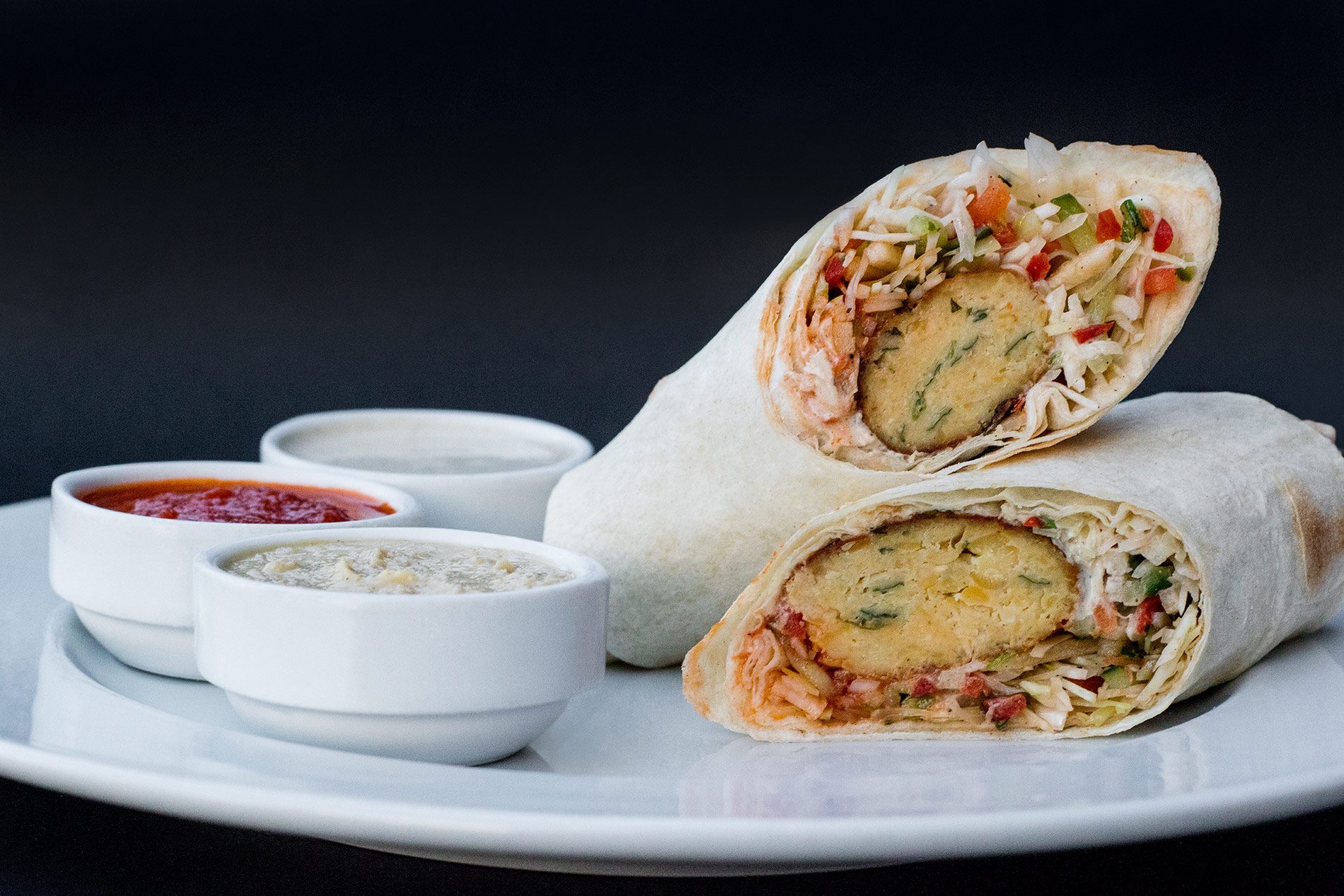 Лаваш разрезать пополам, выложить салат, сверху котлеты фалафеля, полить томатным соусом и соусом тахина.