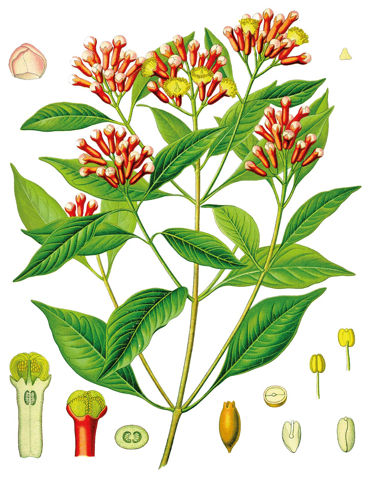 Caryophyllus aromaticus • Острова Малуку в Индонезии, Мадагаскар, Занзибар