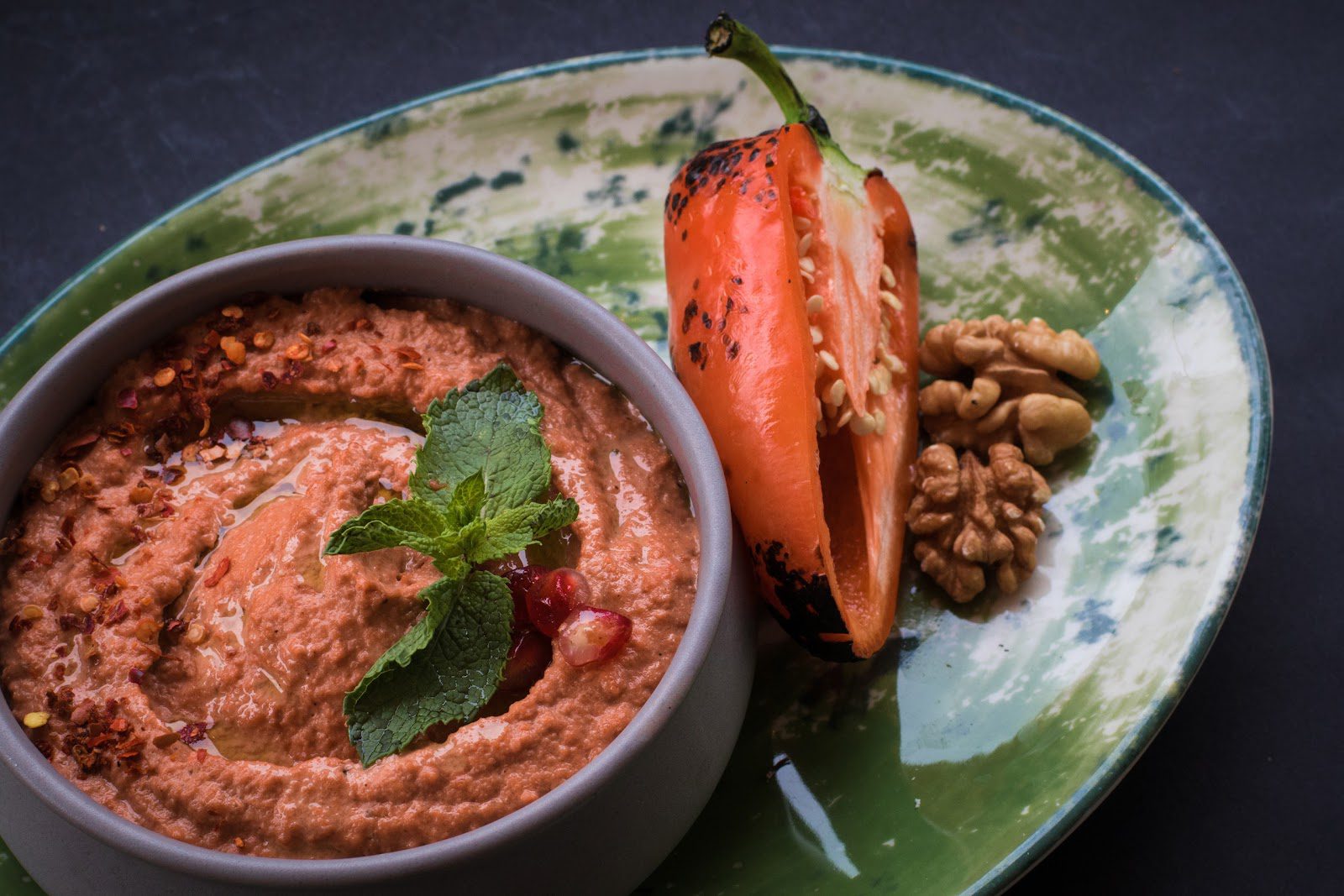 Красный перец помыть, высушить и смазать оливковым маслом. Затем запечь в духовке при температуре 220 °С в течение 25 минут. Оставить остывать и очистить от кожуры и семян.
