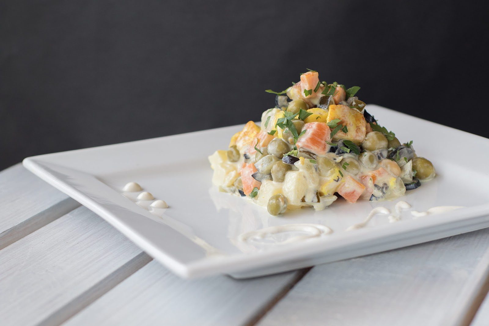 Нарезать кубиками. Выложить в глубокую тарелку и добавить зеленый горошек, жареный тофу, оливки, майонез и соль.