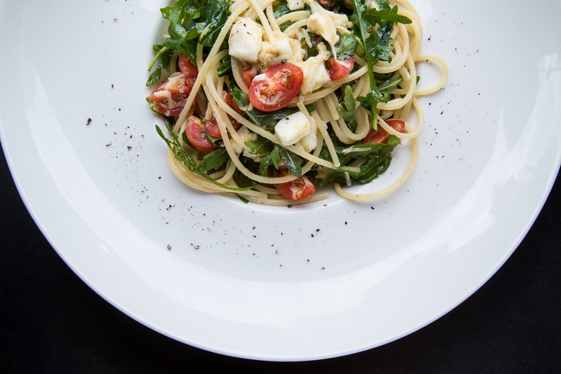 Отварить спагетти. Помидоры разрезать пополам. Смешать все ингредиенты в большой емкости и сразу подавать.