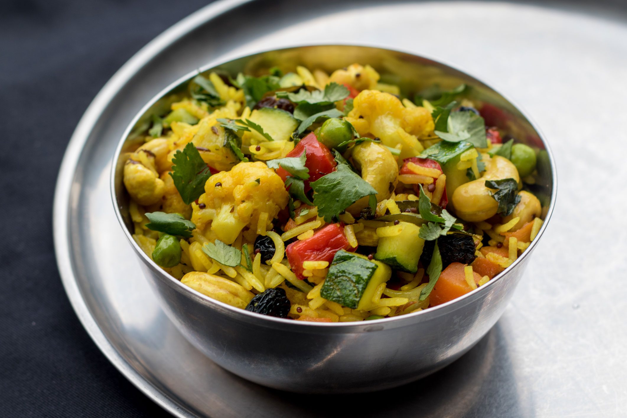 В отдельной кастрюле разогреть масло, добавить корицу, лавровый лист, кумин и кориандр. Затем добавить морковь и обжарить. Положить цветную капусту, сладкий перец, куркуму и орехи, жарить еще 5 минут. Добавить горошек, цукини, изюм, тофу и все остальные специи. Жарить еще 2–3 минуты. Затем добавить готовый рис, хорошо перемешать. Посолить, снять с огня и накрыть крышкой. Дать постоять 10 минут.