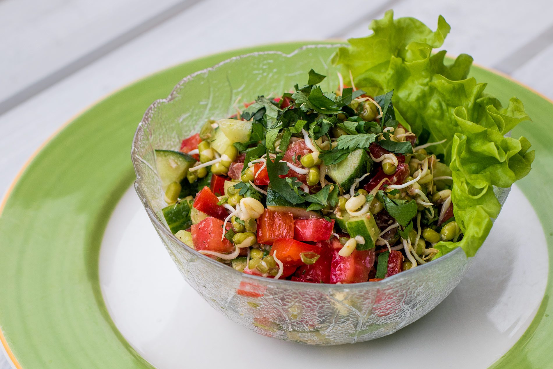 Их нужно промыть и замочить на 6–10 часов, слить воду и снова хорошо промыть. Затем поместить во влажную марлю, сложенную в несколько раз. Оставить на 12–20 часов, периодически смачивая марлю. Семена готовы, когда появятся белые ростки. Хорошо промыть. Все овощи нарезать кубиками, добавить проростки, заправить смесью оливкового масла, хрена и лимонного сока.