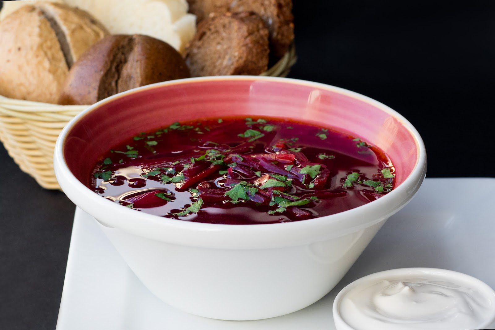 Разложить порционно в тарелки и залить свекольным бульоном.